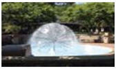 The metallic rays coming from the center of the sphere, sprinkle the water in a round "plate" design that reflect the sunshine or the fountain's illumination and give an admirable water pattern.